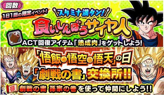 ACT回復アイテム「熟成肉」がGETできる1日1回限定イベント「スタミナ満タン!食いしんぼうサイヤ人」や、「劇戦の書 孫家の巻」を