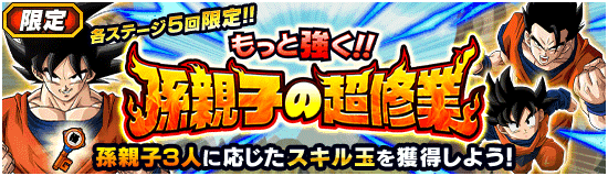 「もっと強く!! 孫親子の超修業」が開催! 期間中、特定のミッションを達成することで獲得できる「限定の鍵」を使って、追憶の扉から各ステージ毎に最大5回まで挑戦可能だ! ステージクリアに応じたミッション達成で「連続攻撃」「会心」「回避」など孫悟空・孫悟飯・孫悟天専用のスキル玉をGETできるぞ!!
