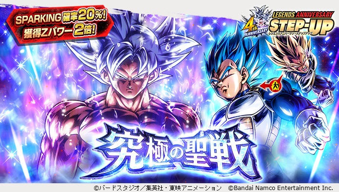 「LEGENDS ANNIVERSARY STEP-UP - 究極の聖戦 -」は、前半に出現Zパワーが通常の2倍&SPARKINGキャラクターの出現確率20%の超お得な特典付き! 6ステップ目は無料で10連ガシャがプレイできるぞ!