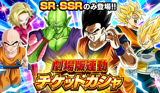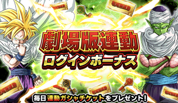 映画「ドラゴンボール超 スーパーヒーロー」の公開を記念してチケットガシャが登場! このチケットガシャではSR・SSRキャラクターのみが登場するぞ! ガシャを引くのに必要な「連動ガシャチケット」はログインボーナスで獲得可能だ!! 集めたガシャチケットを使って仲間を増やそう!