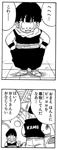 ナメック星で着るために、お母さんに内緒でピッコロとおそろいの服を作っていた。ピッコロをお父さんと同じくらい尊敬しているようだ。