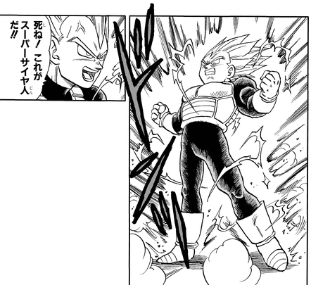ネコマジンの強さに驚いたベジータは、なんと超サイヤ人に変身!