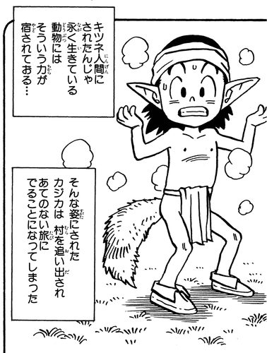 ある日、カジカに殺されたキツネが呪いをかけ、カジカをキツネ人間にしてしまったのです。