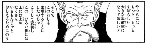 武天老師と呼ばれる伝説の武道家で、フライパン山の火を山ごと消し去るほどの強力なかめはめ波を放つ。