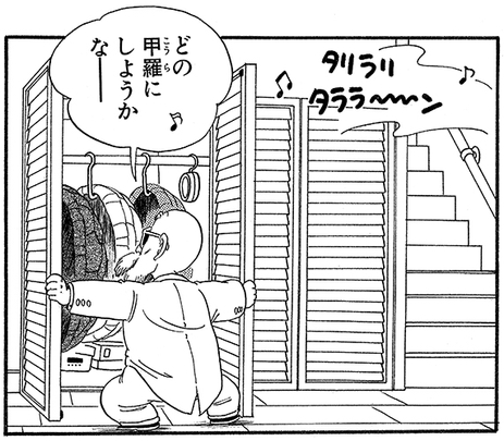 弟子入りの条件として、悟空に「ピチピチギャルを連れて来い‼」と司令を出した亀仙人。オシャレをしてピチピチとギャルをもてなそうと、クローゼットを開けると…いろんなデザインの甲羅がびっしり!