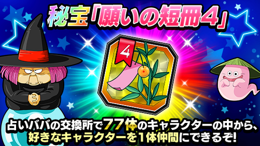 ログインボーナスやミッションで手に入る秘宝「願いの短冊4」は、占いババの交換所でキャラクター1体と交換することができるぞ。ピックアップされた合計77体のキャラクターの中から、好きなキャラクターが選べるのだ。