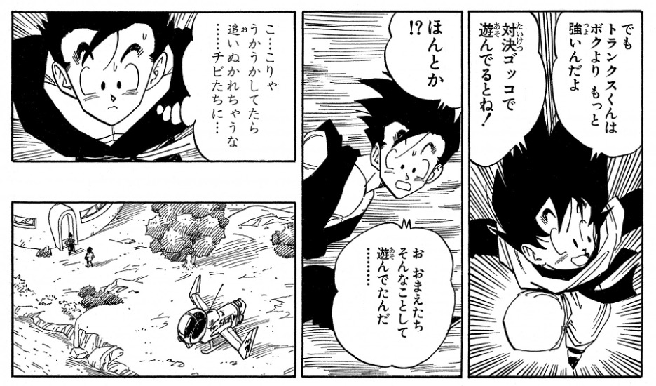 悟空の息子・悟天と、ベジータの息子・トランクスは幼い頃から戦いの才能を開花させますが、二人は普段から「対決ゴッコ」をして遊ぶ親友同士として描かれています。