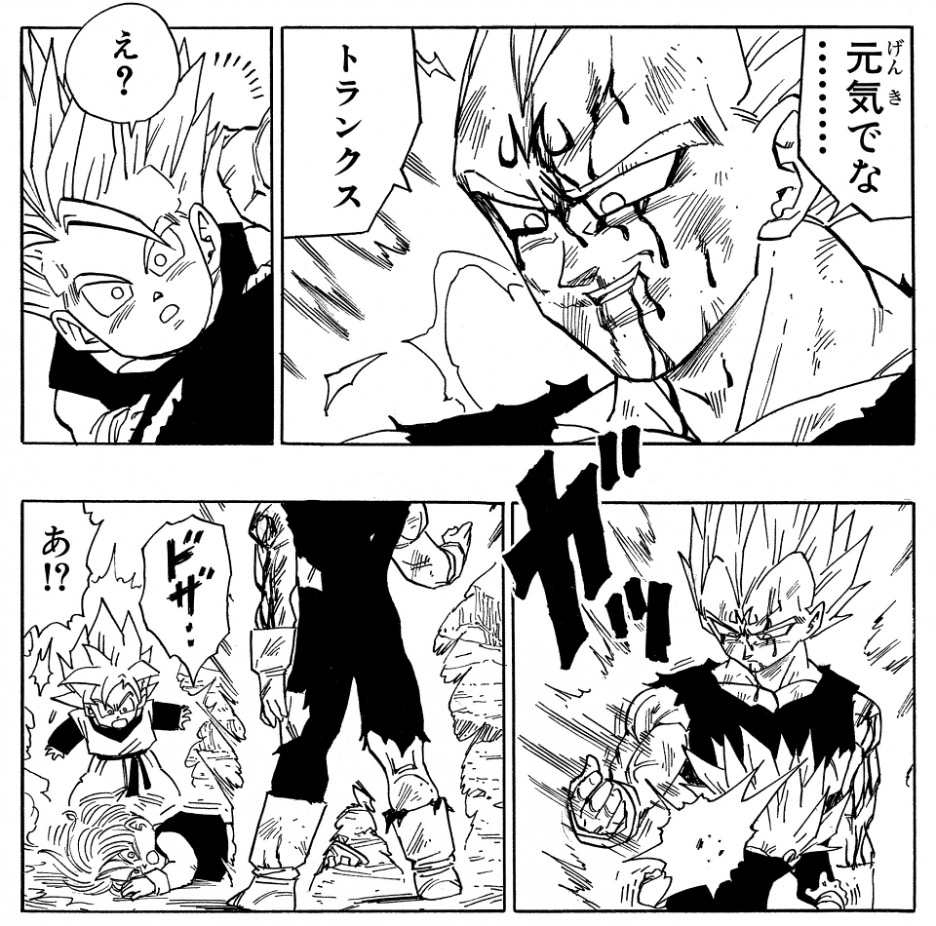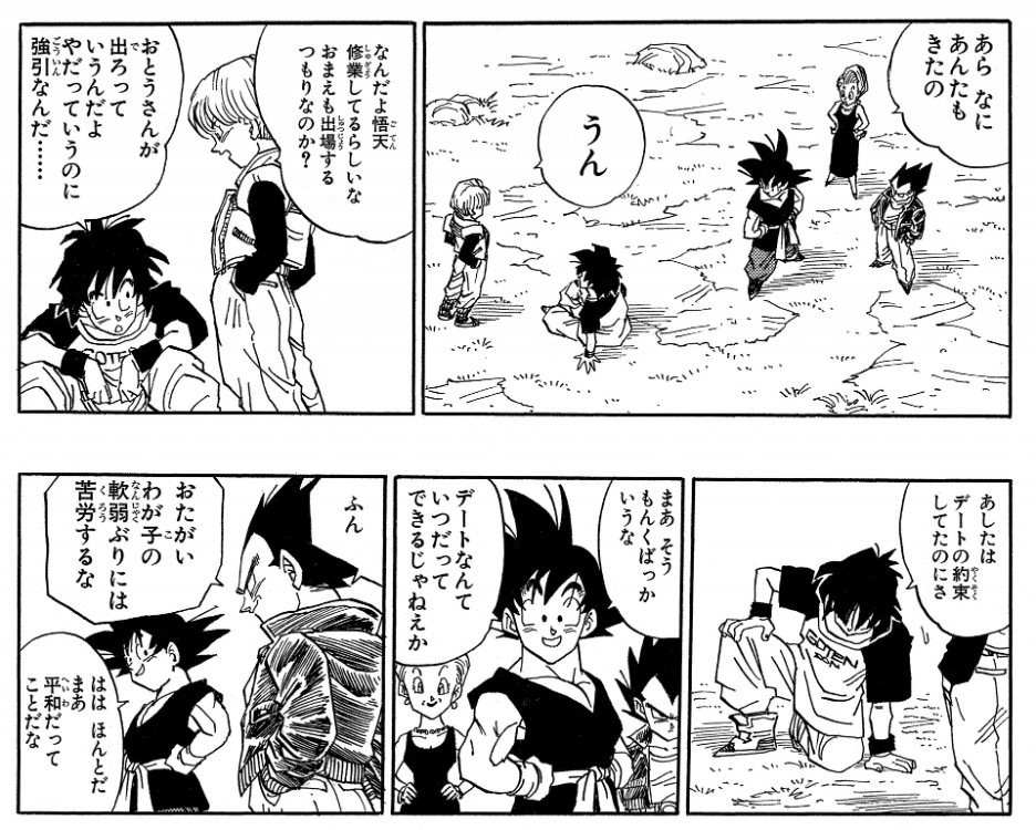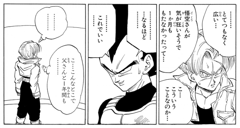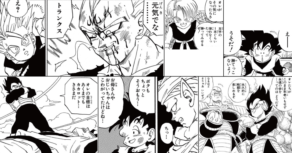 その後父親になったベジータは息子のトランクスに対して、息子というより一人の戦士として接している印象ですが、セル編の終盤では青年トランクスが倒されて激昂するなど、父親としての愛情をのぞかせる場面も登場します。この変化について赤松先生は、 「精神と時の部屋」で長く一緒の時間を過ごすなかで「父子の愛情」と「師弟の絆」が重なった関係が構築されたと考察します。