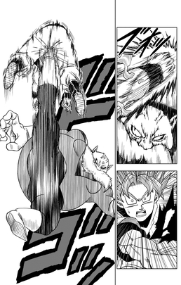 超サイヤ人ゴッド超サイヤ人に変身したベジータと一進一退のバトルを繰り広げていたが、悟空が身勝手の極意〝兆〟に覚醒したことで、ベジータの怒りが爆発。