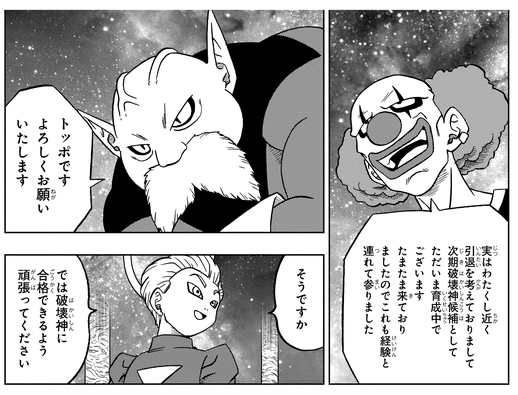 現破壊神のベルモッドが引退を考えているため、次期破壊神候補として直々に指導を受けているようだ。全王の元に全宇宙の界王神と破壊神が呼び出された際には、トッポも次期破壊神候補として帯同していた。ちなみに戦闘力は現破壊神のベルモッドより上だという。