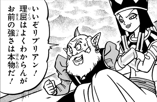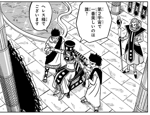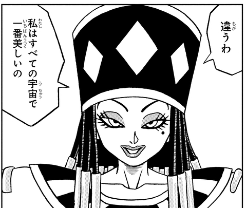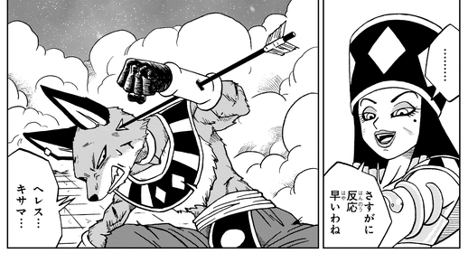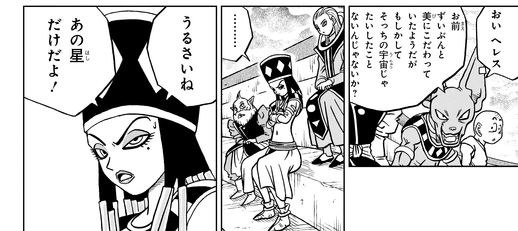 第2宇宙の美的感覚が変だと気づいたビルスから、「お前…もしかしてそっちの宇宙じゃたいしたことないんじゃないか?」と、からかわれていた。