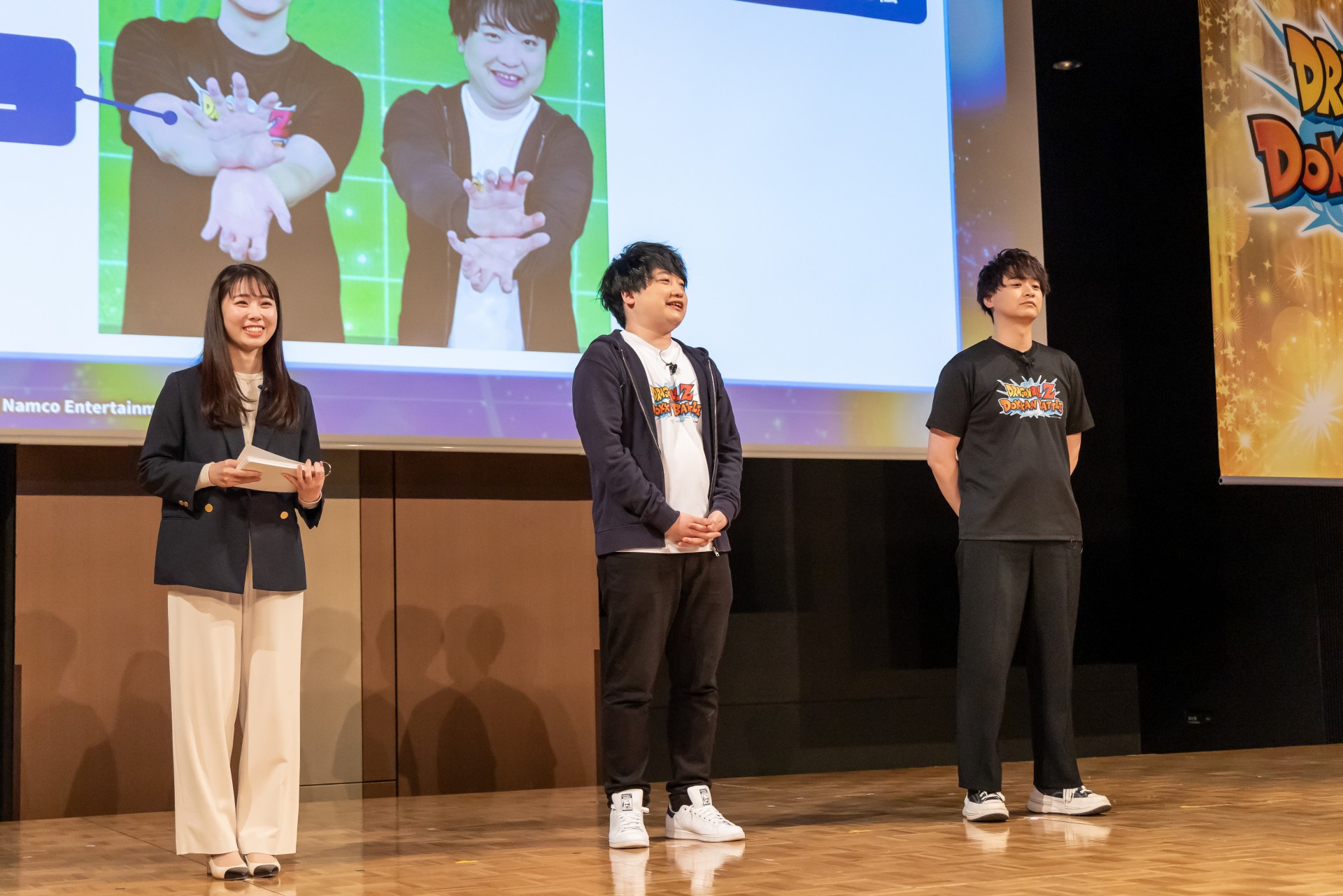 MCの安藤咲良さん、「ドッカンバトル」メインプロデューサーのお松さん、プロデューサーのげっぴーさん、ゲストのぺこぱのお2人が登場!