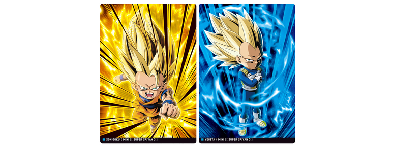 なかでも、「超サイヤ人4孫悟空(ミニ)」は金色箔にてエフェクトを表現した「SR(スーパーレア)」、「超サイヤ人3ベジータ」はホログラム箔押しが施された超豪華仕様「SSR(スーパースペシャルレア)」の高レアリティで登場だ!!