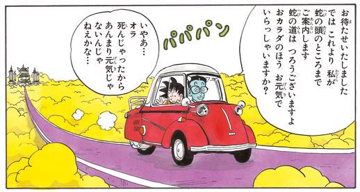 悟空がラディッツとの闘いで命を落とした際に、界王星へと続く蛇の道の入り口までクルマで案内。