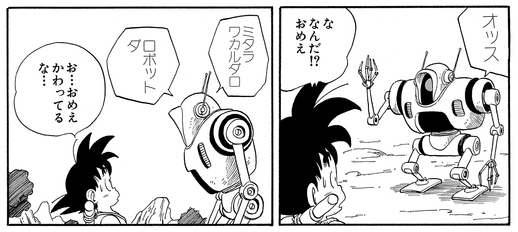 「オッス」と軽いノリで挨拶をしたかと思えば、北の方に行きたいという悟空に「イケバイイダロ」とぶっきらぼうに返事。北の上空で寒がる悟空に「オレハ ロボットダカラ サムクナイ」「アタリマエダ 北ハ サムイ!」と無愛想に答えていたが、最後は「オレガ 凍ッチャッタ……」とお茶目に報告をしていた。