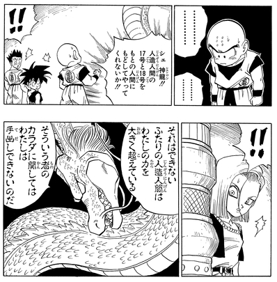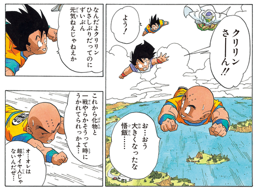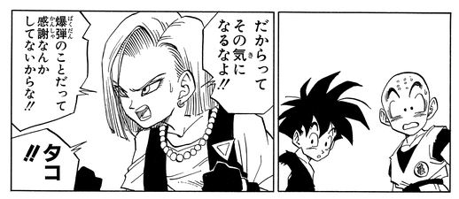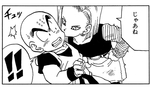 クリリンが神龍に爆破装置を取り除くようお願いしたことを、隠れて聞いていた18号。18号のことがスキだったけど、18号には17号がお似合いだというクリリンに、17号とはふたごの姉弟だと明かす。「だからってその気になるなよ!!」「タコ!!」と言いたい放題だったものの、「またな」と言い残して去っていった。クリリンの思いが18号の気持ちを動かしたようだ。