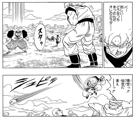 人造人間20号にやられて瀕死のヤムチャを仙豆で回復。