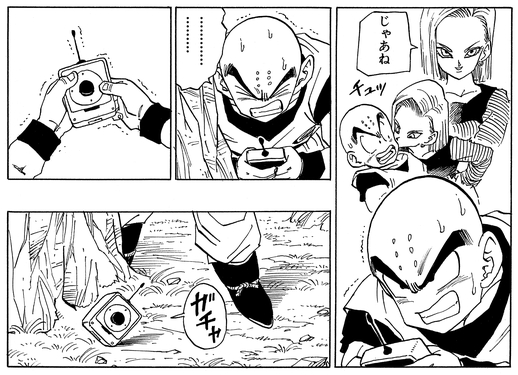 ベジータとセルが闘っている最中に18号を発見するも、18号のことを思うあまり緊急停止スイッチを押すことができなかった。