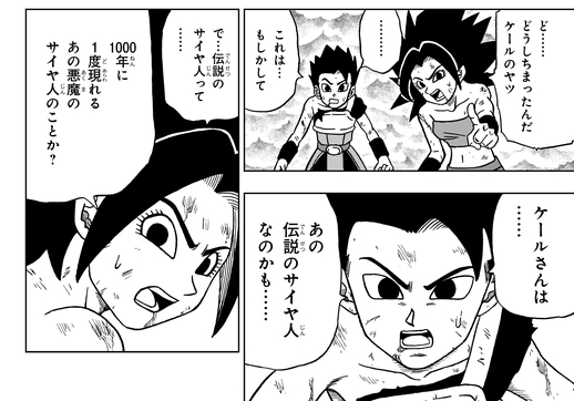 第6宇宙には1000年に1度、悪魔のサイヤ人が現れるという伝説があり、常軌を逸したパワーで暴走するケールを見たキャベは「あの伝説のサイヤ人なのかも……」と推測していた。