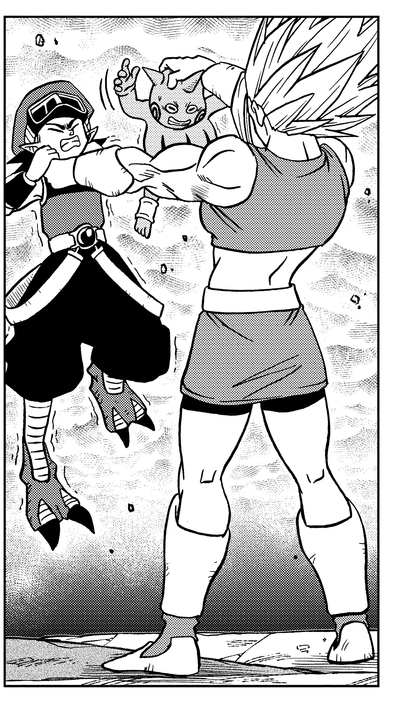 第2宇宙のザーブトとラバンラを倒し、第10宇宙のオブニを場外に殴り飛ばして、立て続けに4つの宇宙を消滅させる。