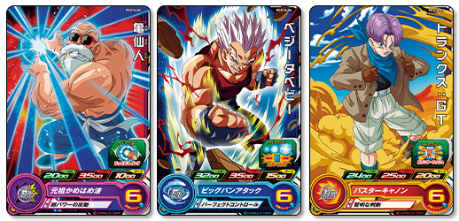 今弾は、TVアニメ『ドラゴンボールGT』から「孫悟空:GT」や「ベジータベビー」、TVアニメ『ドラゴンボール超』から「ベジータ」&「キャベ」の師弟コンビなど様々なキャラクターも収録されているぞ!!
