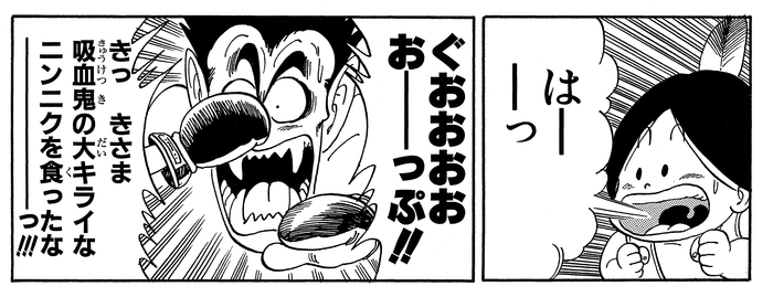 あらかじめ吸血鬼が嫌いなニンニクを食べてきたウパが息を吹きかけると、その臭いに耐えきれずコウモリに変身。