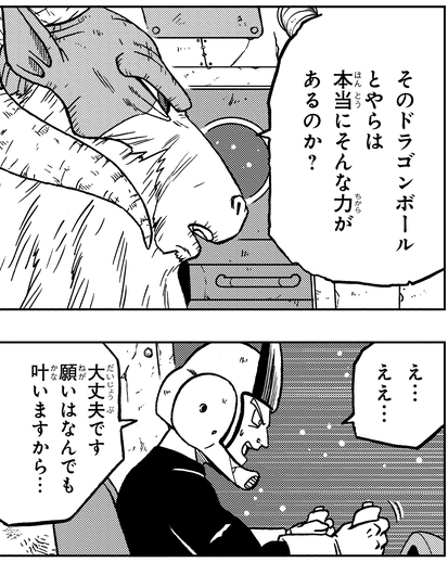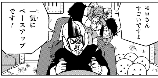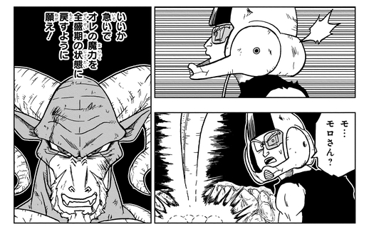 モロの能力であっという間に6つのドラゴンボールを集め、さらにモロが大界王神と闘っている隙をついて7つ目のドラゴンボールを手に入れる。