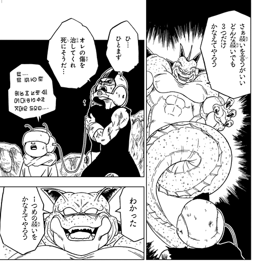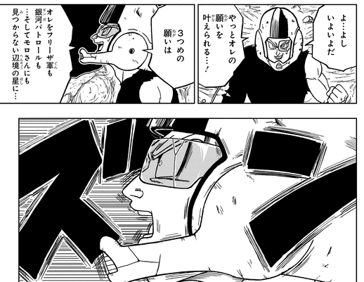 モロの願いを1つ叶える代わりに、3つ目の願いで銀河パトロールもフリーザ軍もいない辺境の星に逃してもらえるよう約束する。