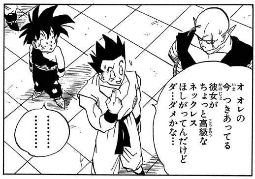 神龍への願いでセルに殺された人々を蘇らせ、悟空も復活させようとしたが叶わず、残りの願いでつきあってる彼女にちょっと高級なネックレスをプレゼントしようとする。