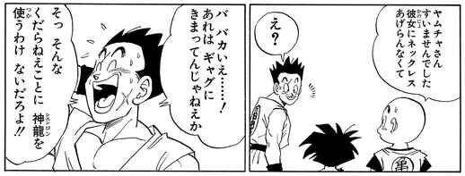 クリリンに謝られると「あれは ギャグにきまってんじゃねえか」と笑ってごまかした。