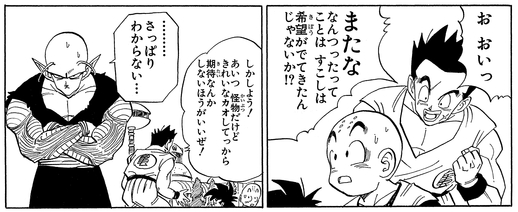 18号がクリリンに「またな」と言い残し去っていくと、「またな なんつったってことは すこしは希望がでてきたんじゃないか!?」と盛り上がっていた。