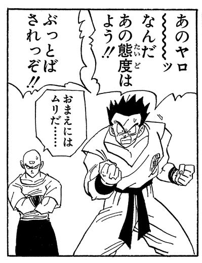 クリリンが18号のことを好きだと知りビックリ! クリリンにそっけない態度をとる18号に「ぶっとばされっぞ!!」と言い放ったが、天津飯に「おまえにはムリだ……」と言われてしまった。
