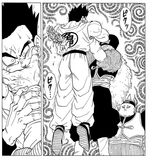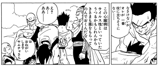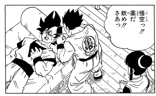 人造人間19号との闘いの最中に病で倒れた悟空をチチの元に連れ帰り、特効薬を飲ませる。