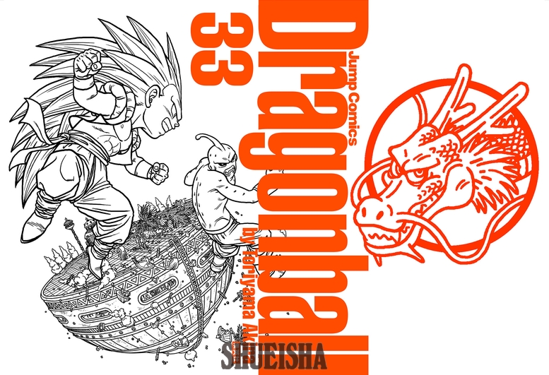 神様の神殿で死闘を繰り広げるゴテンクスと魔人ブウ。派手に壊された神殿が闘いの激しさを物語っている。線画では神殿の内部や飛び散った破片まで、細かい描き込みをよりはっきりと見ることができる。