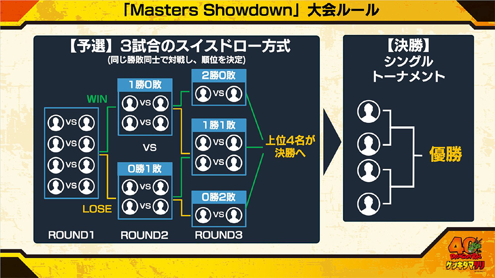 大会のルールは、3ラウンド制のスイス式ルールで、各選手が3組み合わせずつ闘った後、上位4名による決勝トーナメントでチャンピオンを決定!