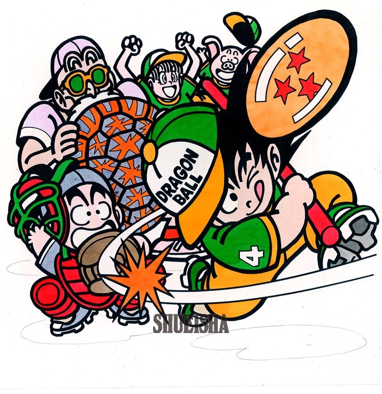 太い線とカラフルな色合いで描かれたポップなイラスト。実際の表紙ではドラゴンボールがピンク色に調整されるなど、よりビビッドな色になっていたため、原画ではありのままの色彩を堪能することができる。