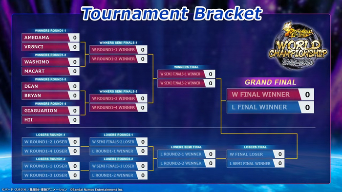 いよいよ試合開始! 2本先取の試合が、ダブルエリミネーションというトーナメント形式で進行します。1度負けてもまだチャンスがあり、2回の負けで敗退が決まります。この試合形式が、【GRAND FINAL】でドラマを生みます――!!