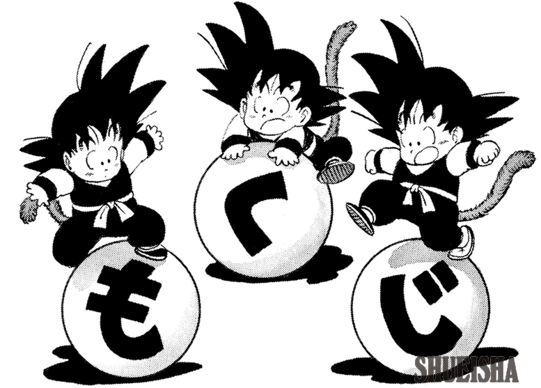 「もくじ」の巨大なボールで玉乗りを楽しむ悟空。焦ったり、踏ん張ったり、慎重に乗ったり…悟空の多彩な表情が面白い。