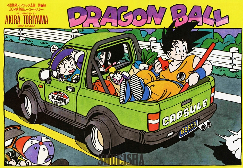 仲良くドライブ中の孫ファミリー。荷台にはたくさんの食料品が! 運転をチチにまかせてマイペースにりんごを食べる姿が実に悟空らしい。