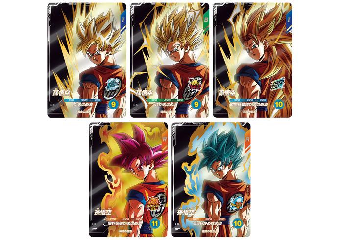 黒い背景に漲るオーラを放つ孫悟空が、同じ構図で描かれたシックで超カッコいいデザイン! 全5種すべてを揃えたくなるカードとなっているぞ!!