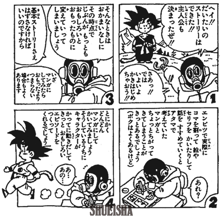「読めば漫画力がつく! 鳥山明先生の天下一漫画指南!!」と題して、鳥山先生が漫画を描くコツを伝授。「とにかくどんどんマンガにしてかいてみましょう そうしてるうちにキャラクターがかってに動きだして きっと おもしろいエピソードをつくってくれるでしょう」と、描きおろしの4コマでわかりやすくアドバイスしている。