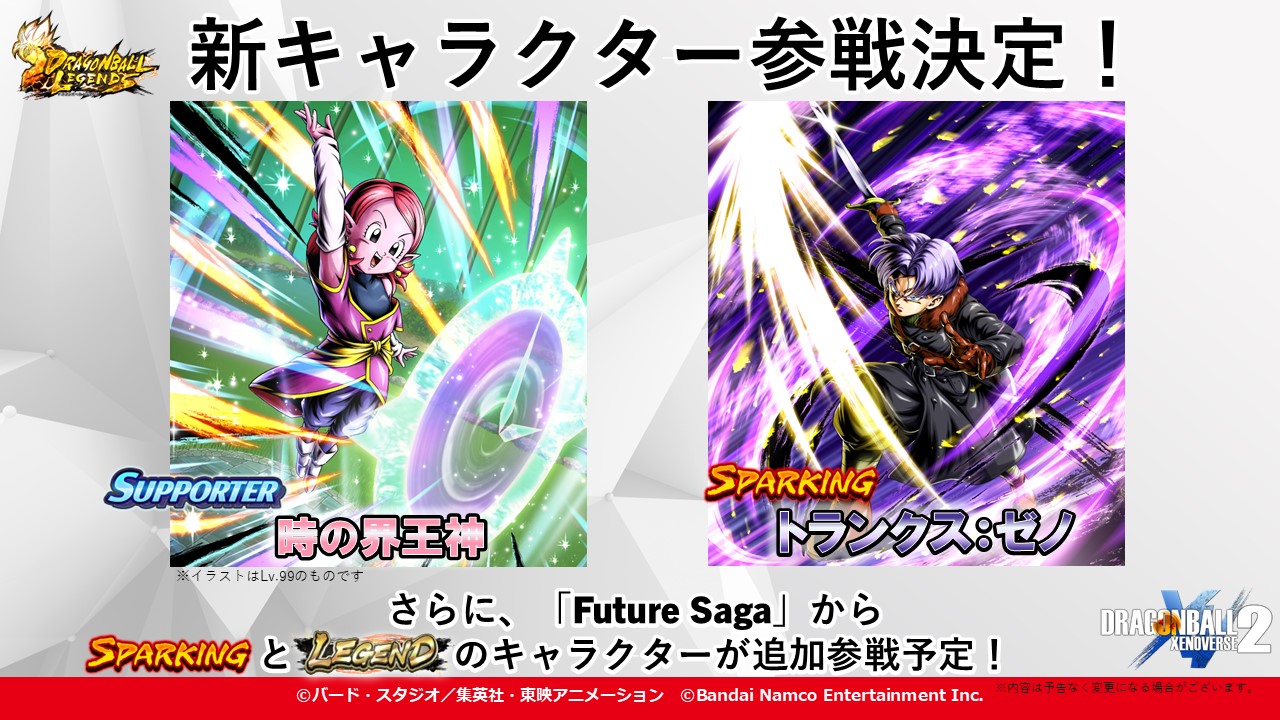 2026年4月28日(火)から「ドラゴンボール ゼノバース2」とのコラボキャンペーンが開始! 新キャラクターとしてSUP「時の界王神」とSP「トランクス:ゼノ」が登場! 今後更に2体のSP、LRキャラクターが「FUTURE SAGA」シリーズより登場予定です!
