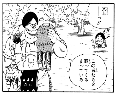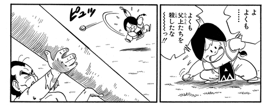 父と悟空を倒した恐るべき敵である桃白白に小石を投げた。一息で跳ね返されてしまったものの、父親譲りの勇敢な姿がうかがえる。