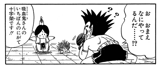 占いババの宮殿では、プーアルと一緒にドラキュラマンと対戦。吸血鬼が苦手なニンニクの臭いの息と十字架のポーズで見事勝利!