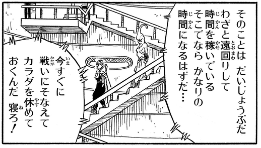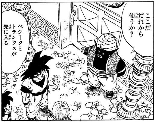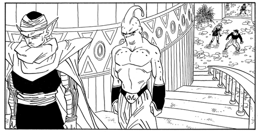 ピッコロさんが悟天&トランクスの修業のため、時間稼ぎで魔人ブウを連れ歩いた場面は、神殿内部の様子が多々描かれる貴重なシーンです。ピッコロさんは、複雑な内部構造をしっかりと把握している様子でした。