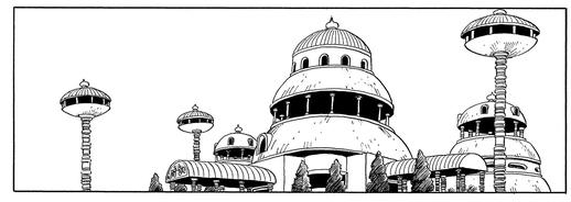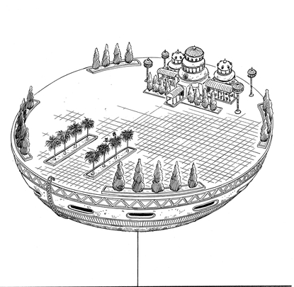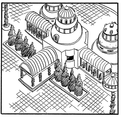 神殿は地上からはるか上空、雲の上に浮いています。どのような力で浮いているのか、どうやって建てられたのか、謎の多い建造物です。神様は、たびたび神殿の縁に立って外界の様子を見ていました。