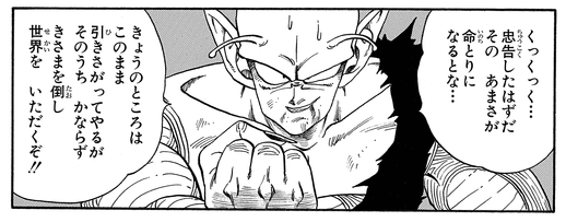 神様にとどめを刺されそうになったところを悟空に助けられ、もらった仙豆を食べて復活。必ず悟空を倒し世界を手に入れることを宣言し、飛び去った。
