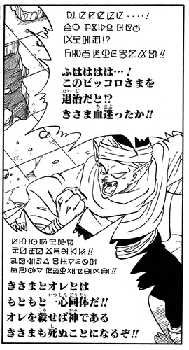 シェンの心を読み、正体が神であることを見抜いたピッコロ。地球人にはわからない、神様と同じ不思議な言葉で会話をしている。実はこの先の物語で、不思議な言葉がナメック語であることが判明する。