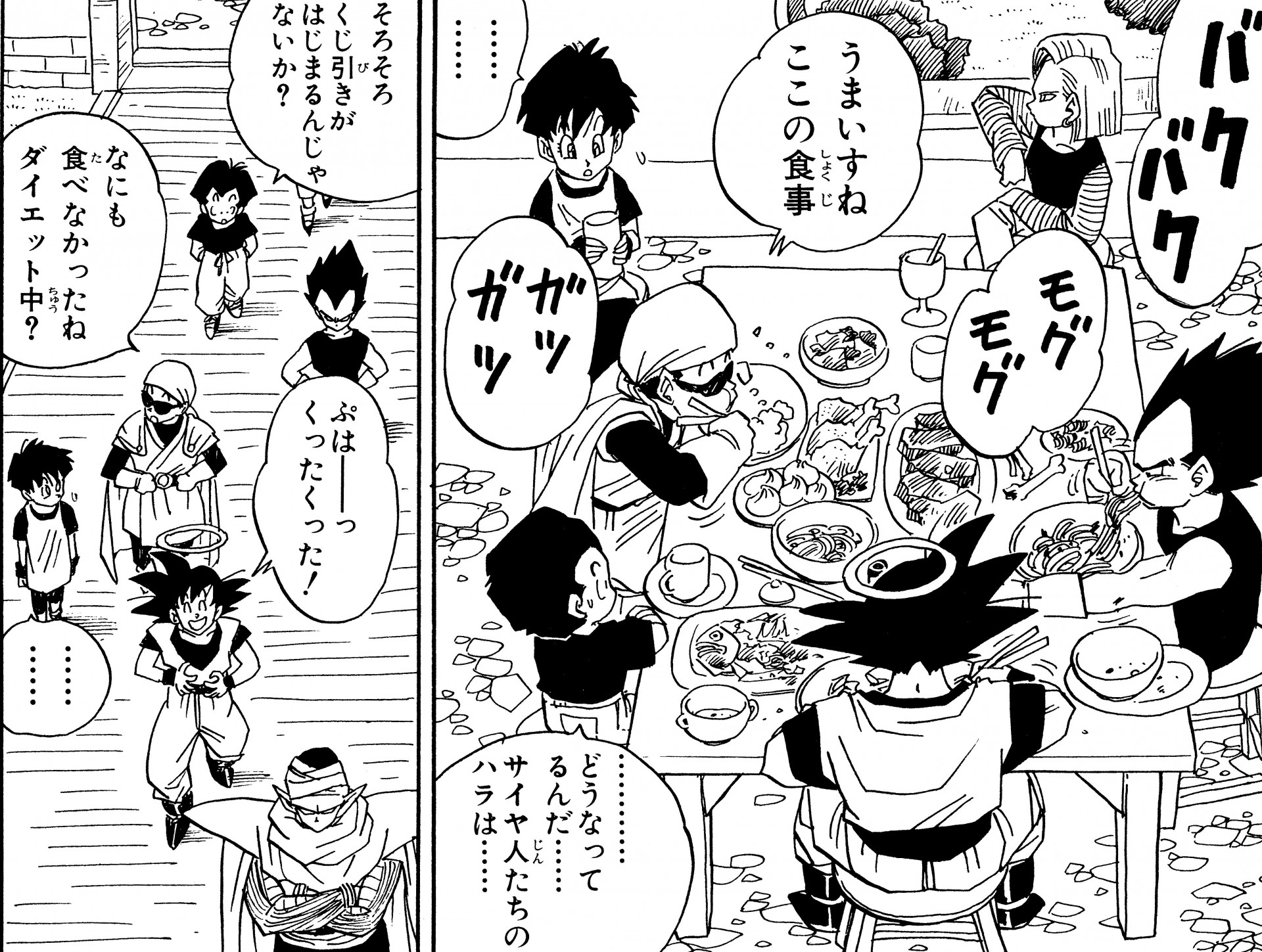 特に、闘いの後の食事が印象に残っている人も多いのでは? 第21回天下一武道会の決勝戦でジャッキー・チュン(亀仙人)と闘った後、悟空はひとりで50人前の料理を完食していた。