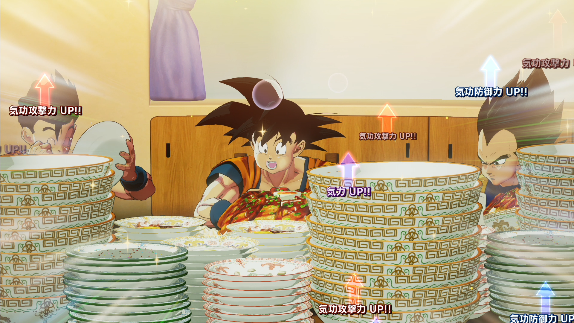 「ドラゴンボールZ KAKAROT」でも食事は重要な役目を担っている。尻尾を使って魚釣りをしたり、恐竜の肉を手に入れたりと、漫画さながらの悟空体験ができるぞ。集めた食材で作った料理を食べるとステータスが上昇!ゲーム内において、食事は「成長」につながる大切な要素なのだ。